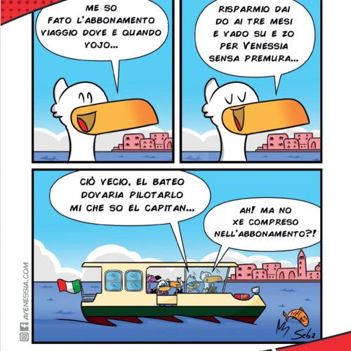 Dialoghi da biglietteria. In un’altra vignetta, l’addetto allo sportello dell’Agenzia Venezia Unica cerca di convincere il nostro gabbiano: “Scusime, ma no te convien farte l’abbonamento anual?” snocciolandone i vantaggi con tanto di finale: “I me farà santo”.