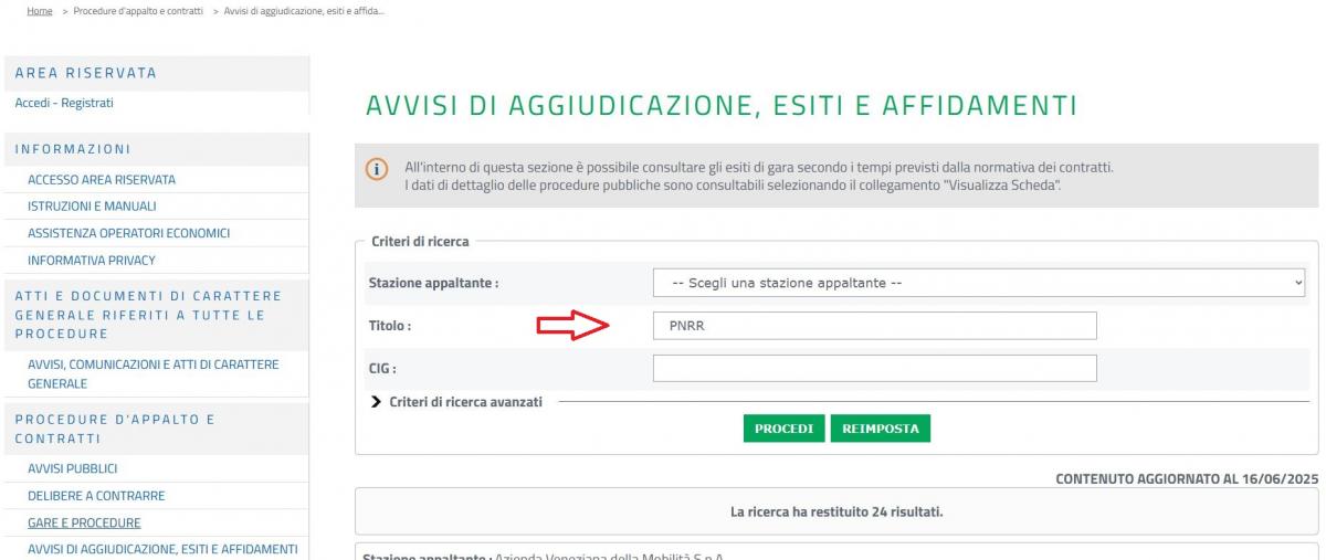 Per una veloce consultazione dei documenti di gara, selezionare la voce “Avvisi di aggiudicazione, esiti e affidamenti” e valorizzare “PNRR” come criterio di ricerca