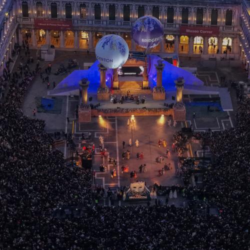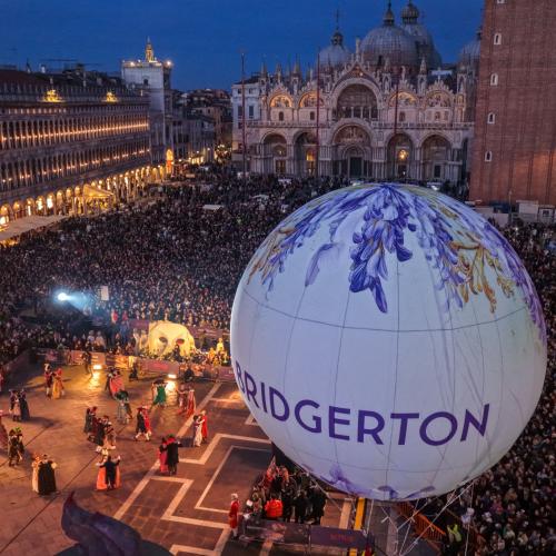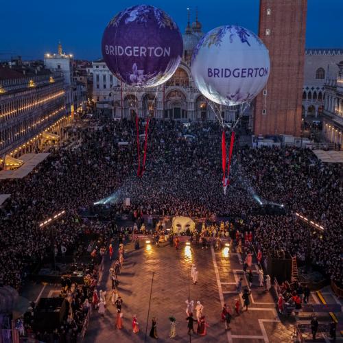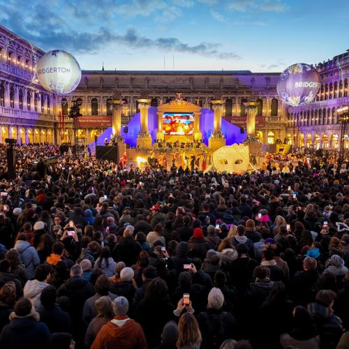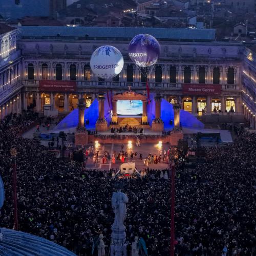 In occasione del lancio globale della quarta stagione di Bridgerton, Netflix ha scelto la cornice iconica del Carnevale di Venezia per un evento promozionale senza precedenti. Il palco di Piazza San Marco è diventato il cuore pulsante di un’esperienza immersiva che ha unito lo sfarzo della Venezia settecentesca con l'estetica raffinata e glamour della serie. L'attivazione ha visto protagonista un corpo di ballo d'eccezione che, in costumi d'epoca rivisitati in chiave contemporanea, ha dato vita a una coreografia coreografica sulle note dei celebri arrangiamenti pop-orchestrali della colonna sonora. Lo spettacolo ha trasformato il salotto più bello del mondo in un esclusivo "ballo stagionale", catturando l’attenzione di migliaia di turisti e cittadini presenti.