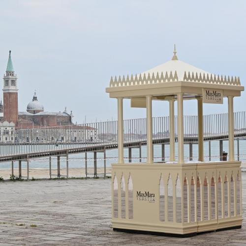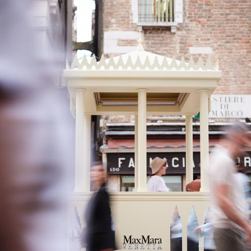 Inoltre due chioschi Max Mara, allestititi in Campo San Bartolomeo e in Riva San Biagio nei giorni della sfilata, sono diventati un ulteriore punto di contatto esterno per raccogliere i dati e raccontare il brand ai consumatori interessati. La struttura traeva ispirazione dalle due facciate principali del palazzo in stile gotico veneziano e dai loro decori che richiamavano gli stili architettonici orientali.